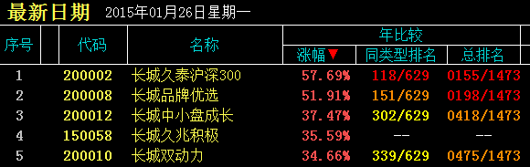 1)长城基金实力雄厚,投资经验丰富。长城基金管理有限公司成立于2001年12月27日,办公地址:深圳市福田区益田路6009号新世界商务中心41层;注册资本:1.5亿元人民币;股权结构:长城证券有限责任公司,东方证券股份有限公司,中原信托有限公司,北方国际信托股份有限公司分别占47.059%,17.647%,17.647%,17.647%的股权。截至2015年1月26日,长城基金已经成功发行了35只基金产品,截至2015年1月26日,长城基金公募资产管理规模为661.11亿元,位列91家基金公司的第31名。下图为长城基金旗下部分偏股型产品近一年业绩表现情况。