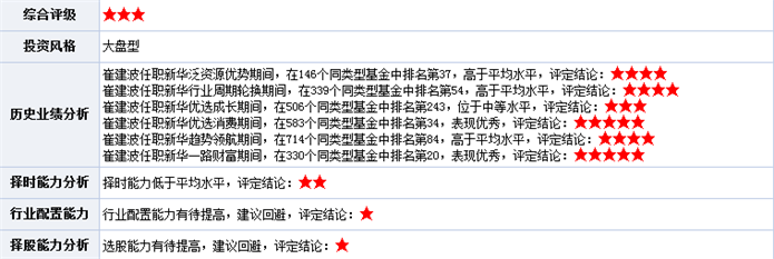 2)基金经理分析:该基金拟任基金经理为崔建波先生。崔建波先生,经济学硕士,历任天津中融证券投资咨询公司研究员、申银万国天津佟楼营业部投资经纪顾问部经理、海融资讯系统有限公司研究员、和讯信息科技有限公司证券研究部、理财服务部经理、北方国际信托股份有限公司投资部信托高级投资经理。现任新华基金管理有限公司总经理助理兼投资总监、基金管理部总监,新华优选消费股票型证券投资基金基金经理、新华趋势领航股票型证券投资基金基金经理、新华鑫益灵活配置混合型证券投资基金基金经理、新华策略精选股票型证券投资基金基金经理。