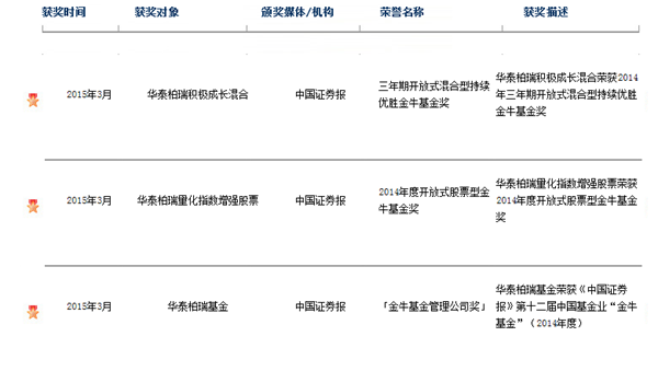 1)华泰柏瑞基金管理有限公司(以下简称:华泰柏瑞基金)是一家中外合资基金管理公司(原友邦华泰基金管理有限公司),公司股东为华泰证券股份有限公司、柏瑞投资有限责任公司(原AIGGIC)、苏州新区高新技术产业股份有限公司。公司于2004年11月18日正式成立,现注册资本人民币2亿元,总部位于上海,下设北京和深圳分公司。公司经营范围包括基金管理业务、发起设立基金及中国证监会批准的其他业务。下图为华泰柏瑞近期所获荣誉: